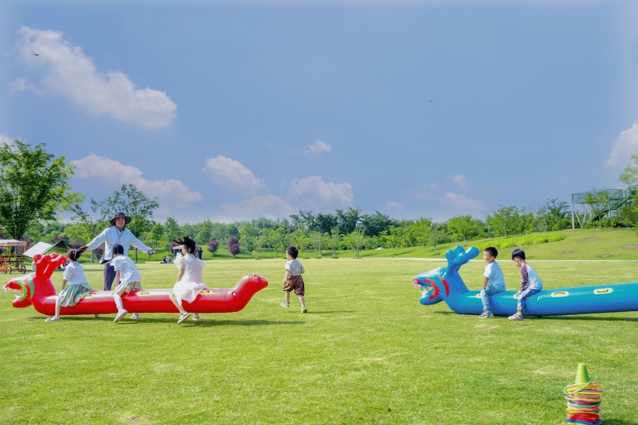 “121、121、121……”端午赛龙舟是中国的传统民俗,也是广受欢迎的水上运动,而近日在“花开海上”,用脚跑起来的旱地龙舟赛,同样吸引了众多来园游客争相报名,记者在现场看到,虽然一组组大朋友、小朋友都是随机配对,但是前行的速度毫不逊色,在响亮的口号声中,参赛者紧抱龙身迈开步子向前冲,玩的人激情澎湃,呐喊的人热情四射。