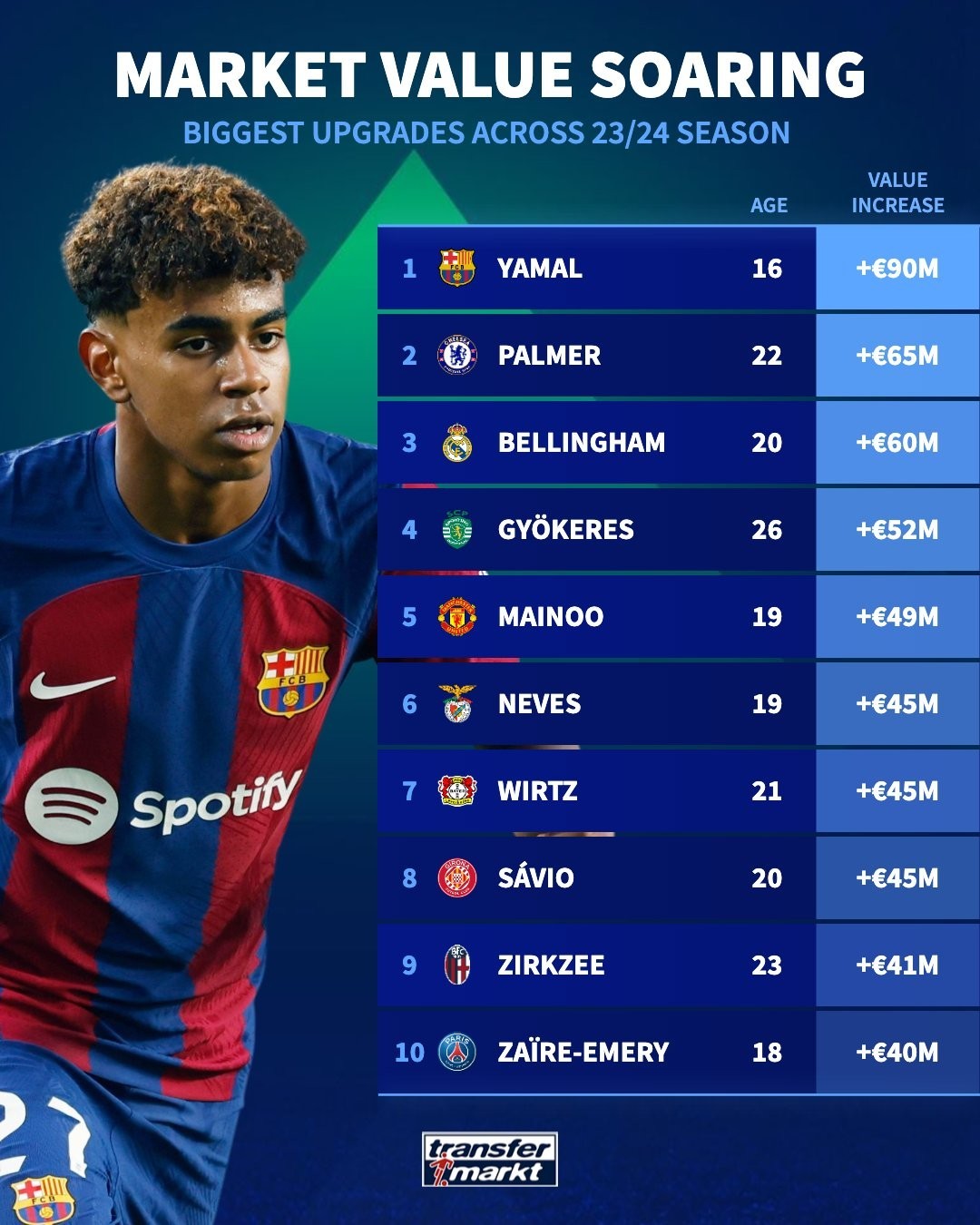 在完成了2023-24赛季最后一次身价更新后,德国转会市场网站列出了2023-24赛季球员身价上涨榜,巴萨16岁小将亚马尔从0到9000万欧,升值最多,帕尔默上涨6500万欧紧随其后,贝林厄姆上涨6000万欧排名第三。