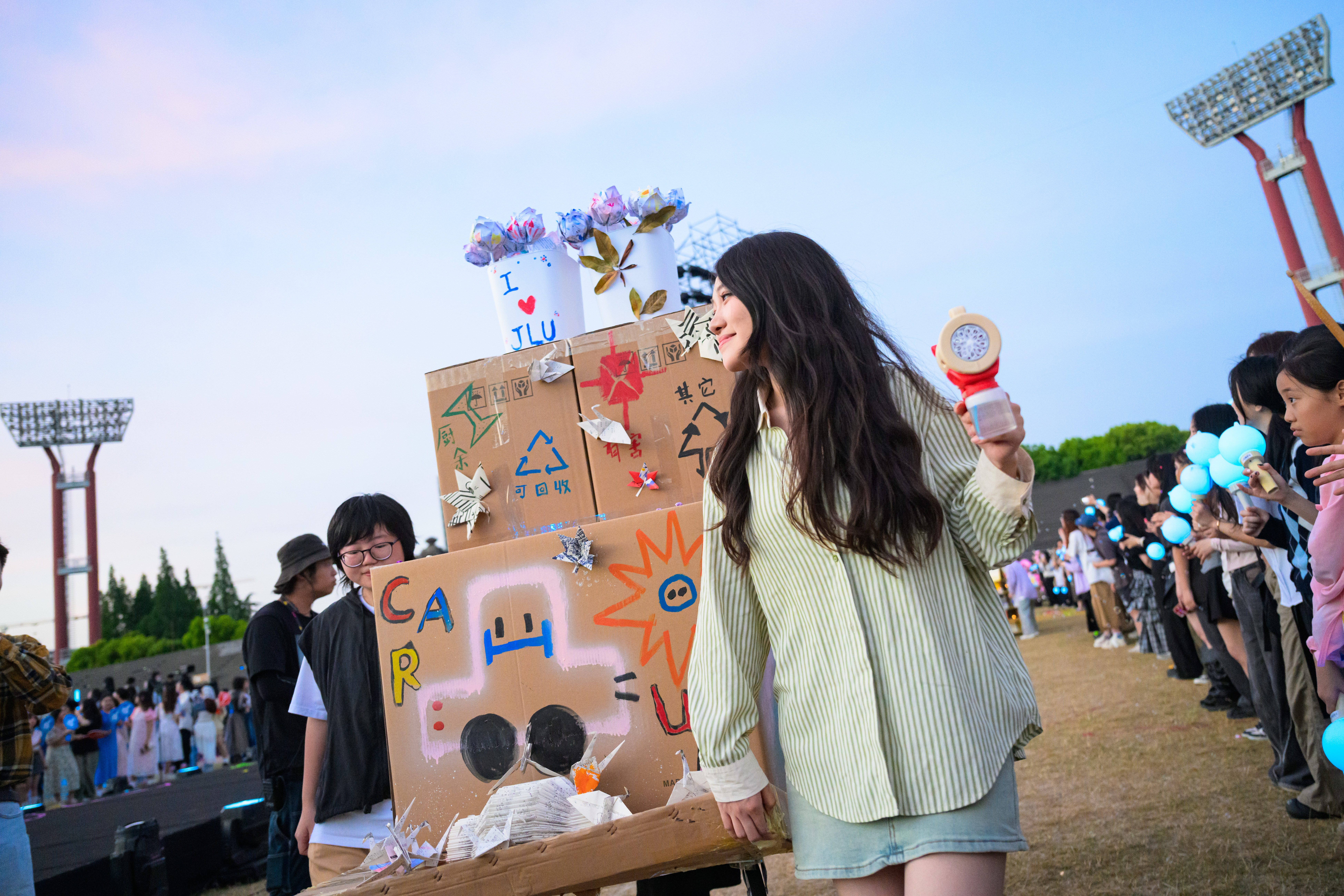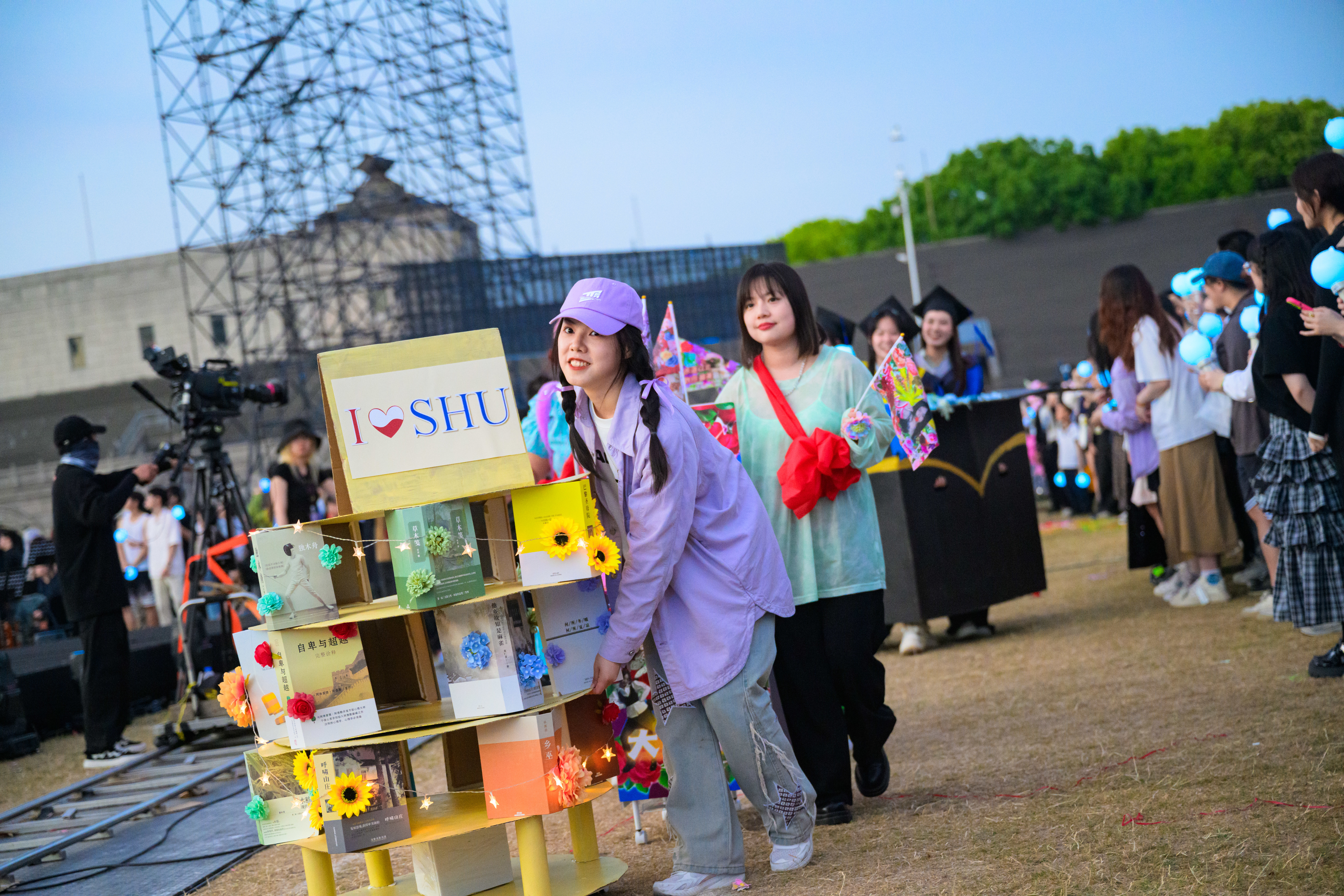 来自吉林大学的徐梦媛用毕业生留下的纸箱拼搭成小车,承载着无数温暖的回忆;就读于上海大学的李佳伊拿出心爱的书籍,点缀着生日蛋糕一般的花车;同济大学、上海工程技术大学的学生们则将电动方程式赛车开到跑道,瞬间夺人眼球……在歌会入场仪式中,由15所高校带来的23组花车组成巡游车队,展现了当代大学生的创意和风采。“这辆赛车的制作周期接近两年,几乎陪伴了我们的大学生活。”上海工程技术大学的车队队长崔嘉豪告诉记者,队员们为赛车增添了新涂装,将日常的生活学习用品绘制在了车身上,“希望所有同学都能顺利驶上事业和人生的快车道”。