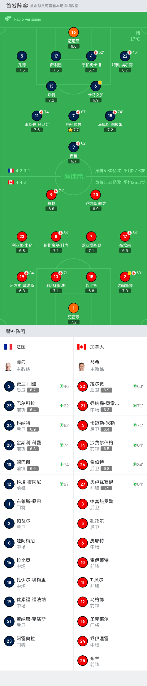 北京时间6月10日国家队友谊赛,法国主场对阵加拿大。最终比分法国 0-0 加拿大。