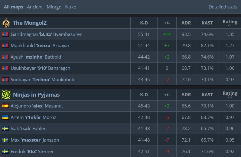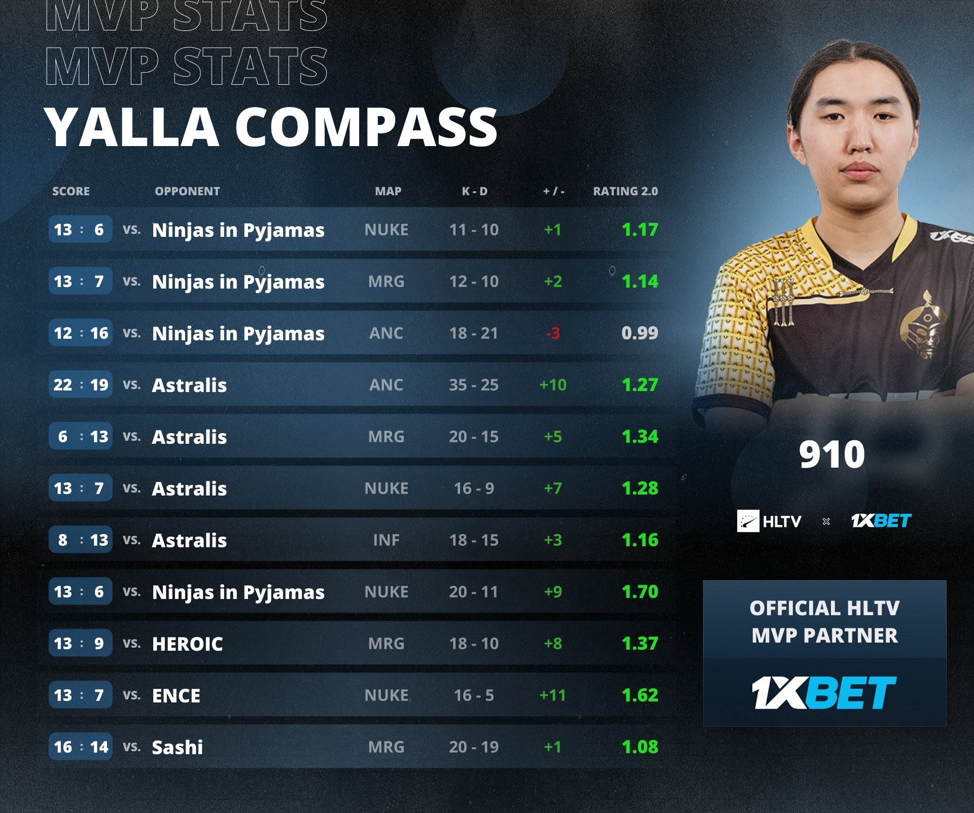 同时,蒙古队内主狙910在本次赛事出战11张地图,拿下场均1.25的rating,荣获赛事HLTV-MVP称号,这也是CS历史上首位获得HLTV-MVP的亚洲赛区亚洲选手。