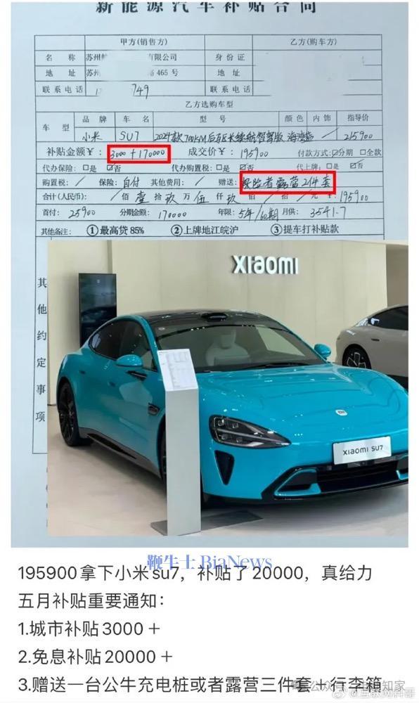 鞭牛士 6月10日消息,近日,网传一张购车合同显示,小米汽车5月开启补贴政策,单车补贴2万元,20万不到就能落地,甚至还赠送一台公牛充电桩或露营三件套。