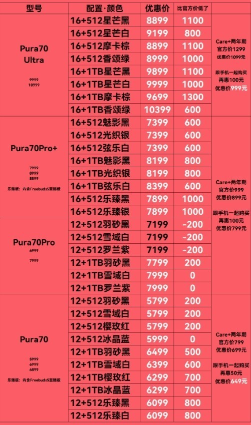 如图,华为Pura 70不同版本和配色的优惠幅度不一样,但都比官方价更低或者齐平。其中,12GB+512GB乐臻黑/白的优惠幅度最高——800元,12GB+1TB的樱玫红、冰晶蓝两个配色的优惠力度也较大——700元。Pura 70 Pro的整体优惠幅度最小,最多只降价200元,12GB+512GB版甚至要加价。