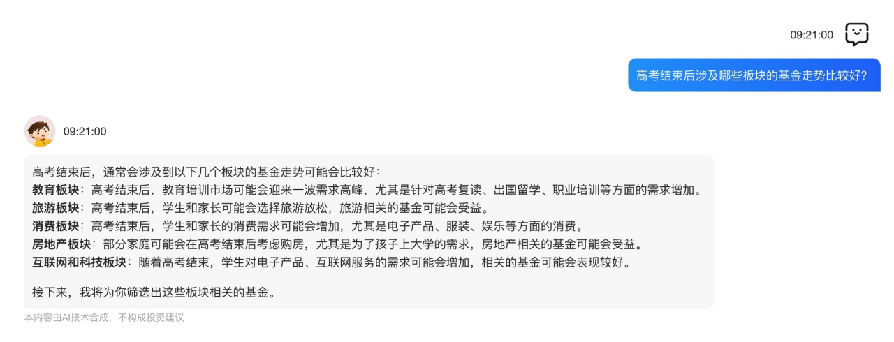 6月11日,有用户使用“基金通”专业版提问:历年高考结束后,哪些板块的基金走势比较好?