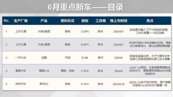据CNMO了解,6月将有5款重要新车陆续上市。据媒体统计,它们包括了大家9超混、大家7超混、全新迈腾、零跑C16以及银河旗下的E5车型。