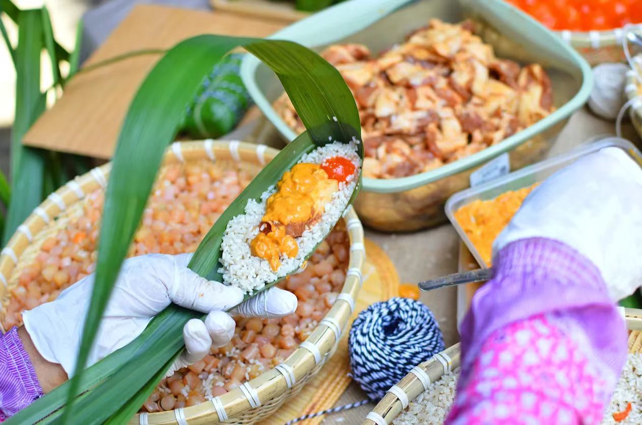 海胆粽的制作过程相对简单,用料却极其讲究。包粽使用的芒叶要到海拔200多米的山上去找,并且要早上日出时摘下才更为清香。包粽的时候先将两片芒叶一横一竖放好,再依次放进泡好的糯米、一条上好的五花肉和炒料,最后盖上满满一勺黄澄澄的海胆,用粽叶包成规整的长圆形,用咸水草捆裹结实,一条海胆粽才算制作完成。如今,海胆粽逐渐走出南澳,成为外界了解深圳的一张美食名片。