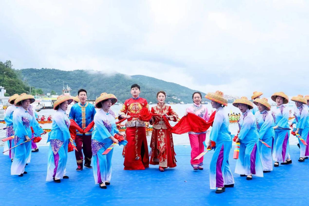 在比赛间隙,月亮湾海面上还上演了南澳渔民娶亲非遗展演,两艘装点着喜庆红绸的渔船,分别载着新郎和新娘相向而来,渔歌回荡在海面,勾起人们浓浓的乡愁情愫。游艇帆船、极限冲浪等水上运动表演助阵,不仅为端午节增添了热闹的气氛,也让更多人感受到了水上运动的魅力。