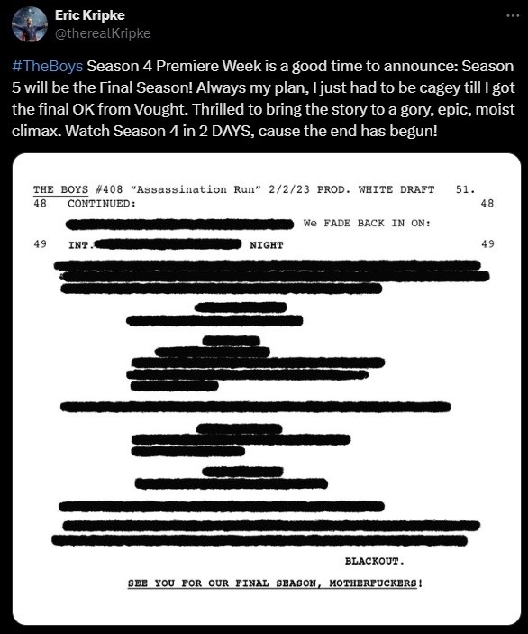 之前Kripke确实说过该剧至少需要五季,但亚马逊上月续订时并未确认第五季是否为全剧最后一季。《黑袍纠察队》催生了多部衍生剧,除正在制作的《V世代》第二季外,还有两个正在筹划的项目。