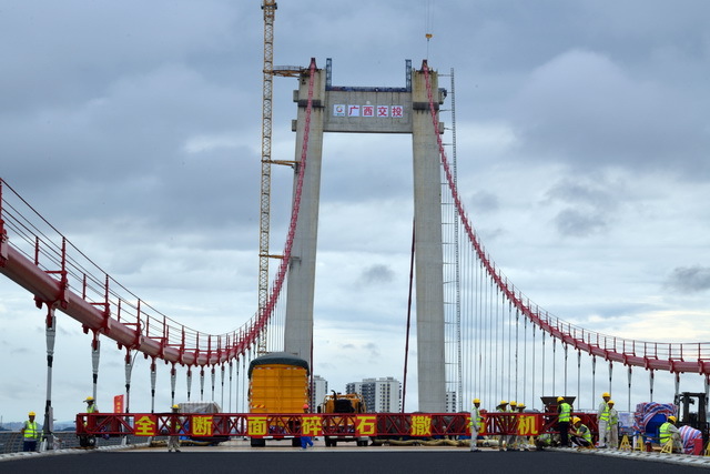 6月5日,在龙门大桥主航道桥上,第一财经记者看到,钢桥面铺装、附属结构安装和防腐涂装施工正在进行。广西交投集团龙门大桥项目指挥部副指挥长何锦章介绍,龙门大桥工程是广西在建的最长跨海大桥,项目建成后将打通广西滨海公路的“卡点”,防城港与钦州港的通行时间由原来的1.5小时缩短至25分钟左右,对促进北钦防一体化,推动北部湾经济区高质量发展,助力西部陆海新通道建设,具有重要意义。