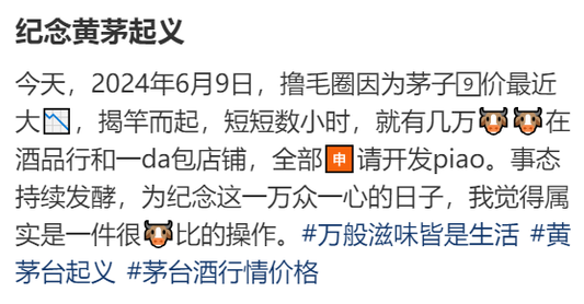 在社区平台,黄牛们开始集体反水,短短数小时,就有几万黄牛在酒品行全部申请开票,甚至号召同行集体拒收货,并将6月9日定为“黄茅起义”。