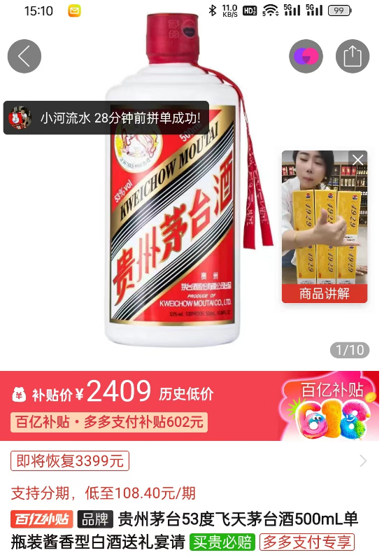 而易简财经搜索拼多多发现,已经有商家将散装飞天茅台定价为2409元/瓶。
