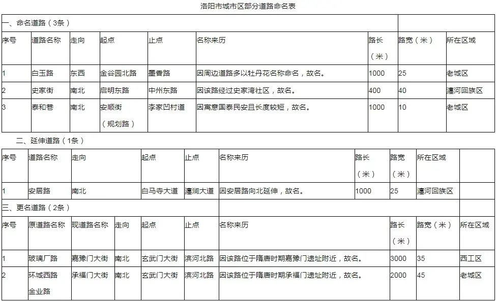 2024年,随着我市城市区建设规划项目不断推进,部分城市区新修、扩建、延伸道路陆续建成通车,道路交通设施日益完善。为展示我市良好形象,推进全市地名标准化、规范化建设,方便群众日常生产生活,市民政局依据《地名管理条例》《河南省地名管理办法》,按照“大路体现文化和历史,小路突出乡土和特色,长路分段命名,长期使用的路名尽量保持稳定”的原则,并征求相关部门意见,多次修订命名方案。经2024年5月6日市政府第26次常务会议研究审定,决定对此次需要命名、更名的6条道路进行规范命名,其中老城区3条、瀍河回族区2条、西工区1条。
