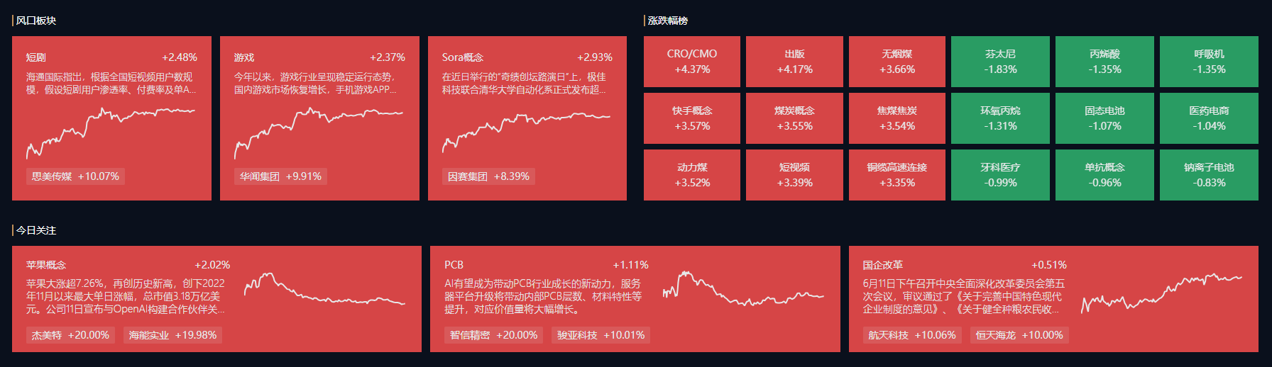 6月12日,市场情绪有所回暖。据南财金融终端,行业方面,电子(申万一级)早盘一度领涨全市,其中消费电子、苹果、MR等相关概念均涨超2%。午后概念涨幅有所回落,截至收盘,苹果概念涨超2%,成分股中,智信精密、杰美特、海能实业实现20CM涨停,神宇股份、赛腾股份等股涨超10%。