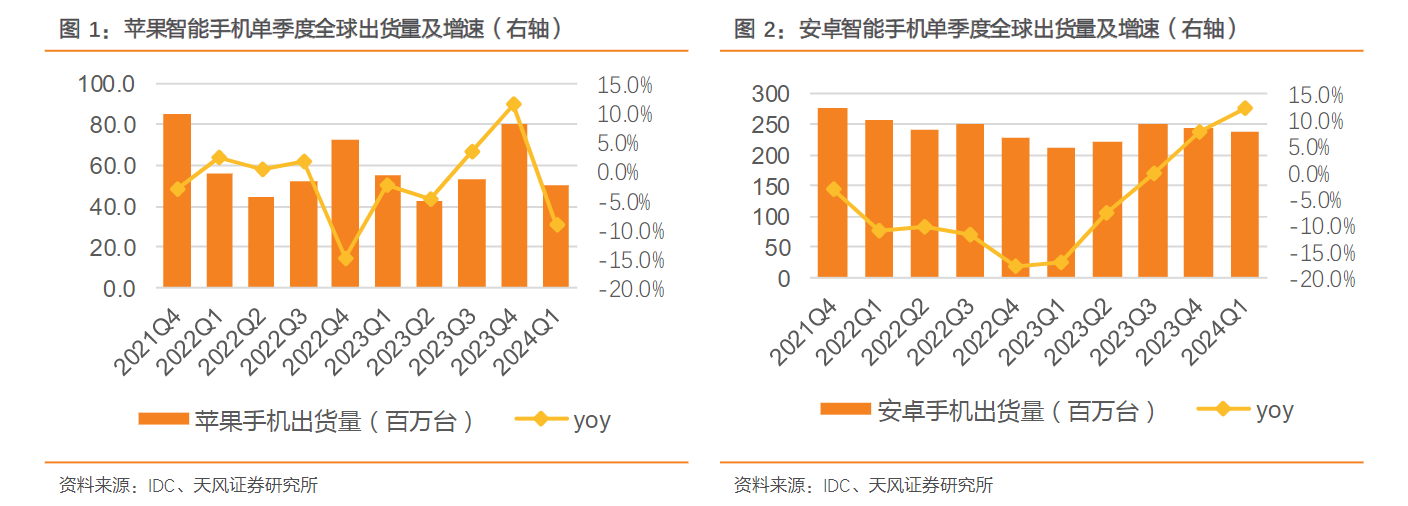行业层面而言,2023年全球智能手机需求缩紧,但苹果手机出货量实现“逆风”稳增,2023Q4出货量同比增长11.3%。不过2024Q1,苹果出货量增速明显承压,同比下降9.2%。相较之下,安卓手机Q1延续复苏势头,出货量同比增长12.1%。