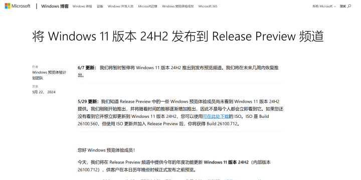微软此前已经在正式公布了下一代Windows 11 24H2版本的各项功能,并且联合多家厂商公布了支持相关功能的全新Windows AI PC。此前,微软已经开始在 Release Preview 频道上向 Windows Insiders推出的Windows 11 24H2抢先体验版本,不过外媒发现,微软目前已经悄悄暂停了相关版本的更新。这次暂停是通过在原始发布博客中添加内容的方式宣布的。