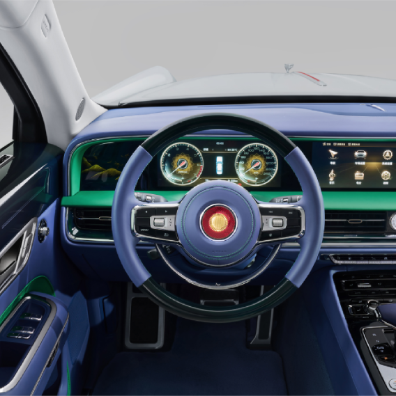 车内方向盘中央为“金葵花”Logo,中控启用了触摸大屏,车内有多种颜色搭配,采用了中华非遗的大漆及刺绣工艺,并用水墨手法呈现出来。