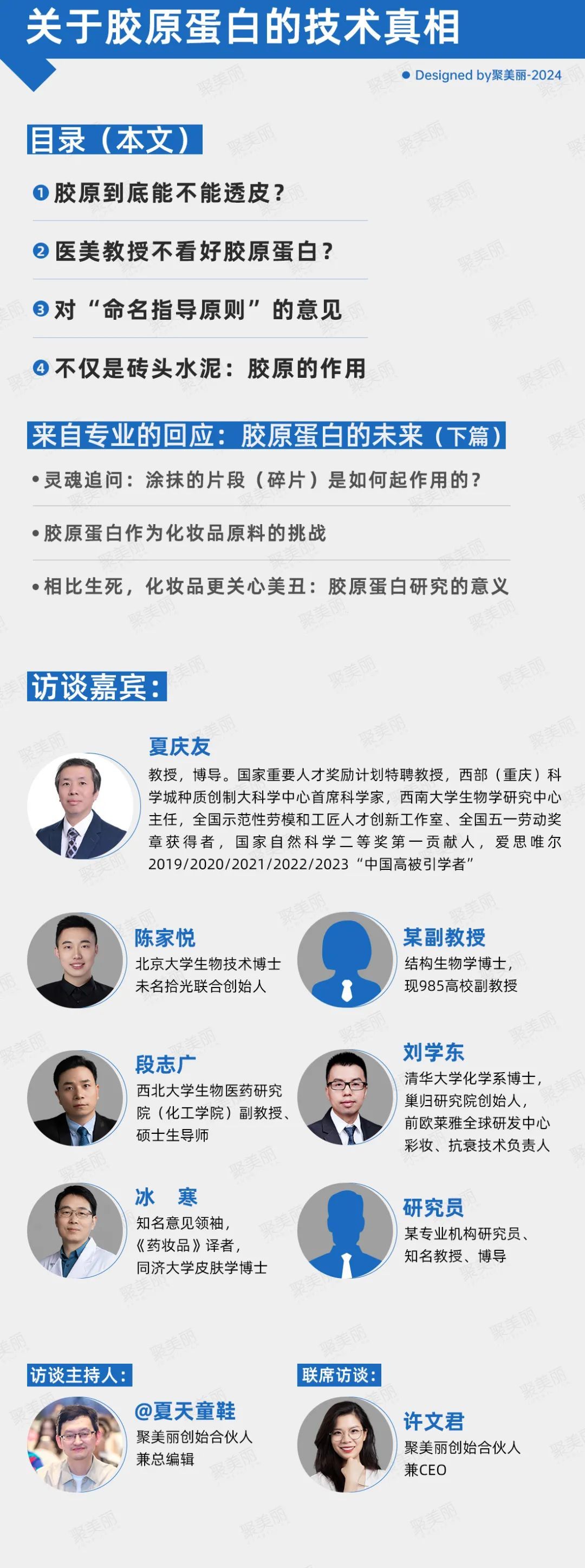于是,我们着重针对前文中提及的主要质疑,走访、访谈了在中国胶原蛋白领域近十位有着深入研究的前沿科学家、皮肤科博士、技术专家们,汇集成一篇能让化妆品行业上下游从业者更全面、客观、科学地看待胶原蛋白的研究型文献。