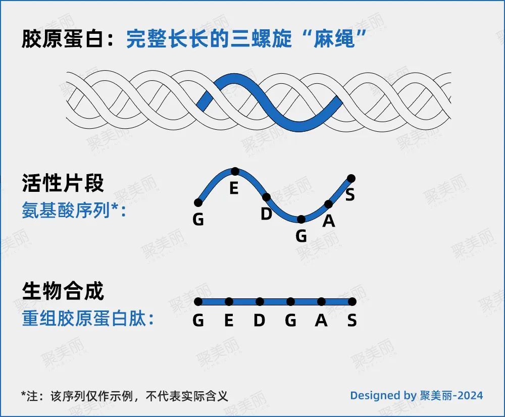 目前市面上能批量购买到的作为化妆品原料的重组胶原蛋白,并不是全长的三螺旋的完整结构蛋白,而是从其中一条肽链中选择具有生物活性的某一片段‘重组”合成的。其中很多片段的氨基酸序列并不长,所以我们可以理解为都是“肽”。