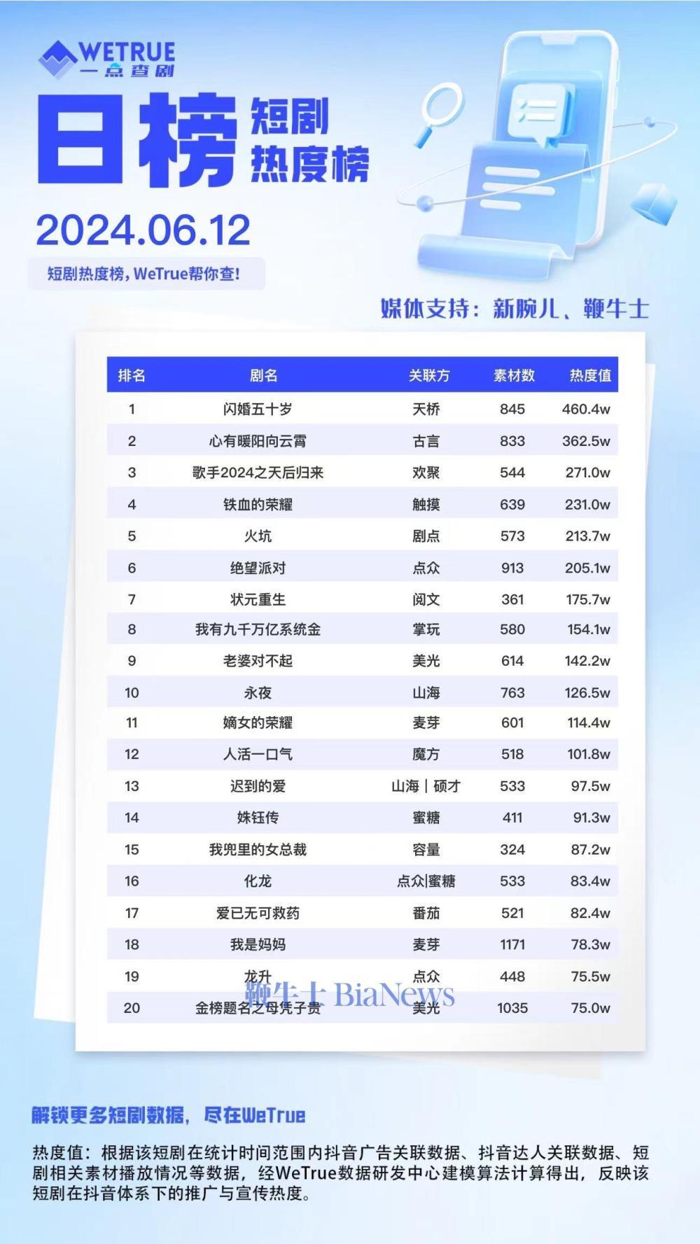 编者按:为帮助短剧从业者提供更多信息,专注于短剧报道的新腕儿和科技媒体鞭牛士联合WETRUE短剧热度榜共同推出短剧热度榜。