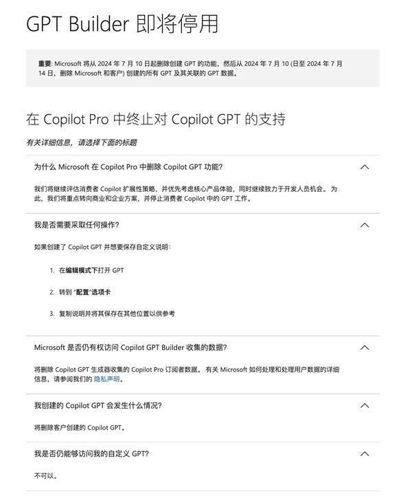 然而,所有这些定制的 GPT 将在 7 月 14 日后无法访问,微软仅提供了在 " 编辑 " 模式下复制说明并保存在其他地方的有限让步。