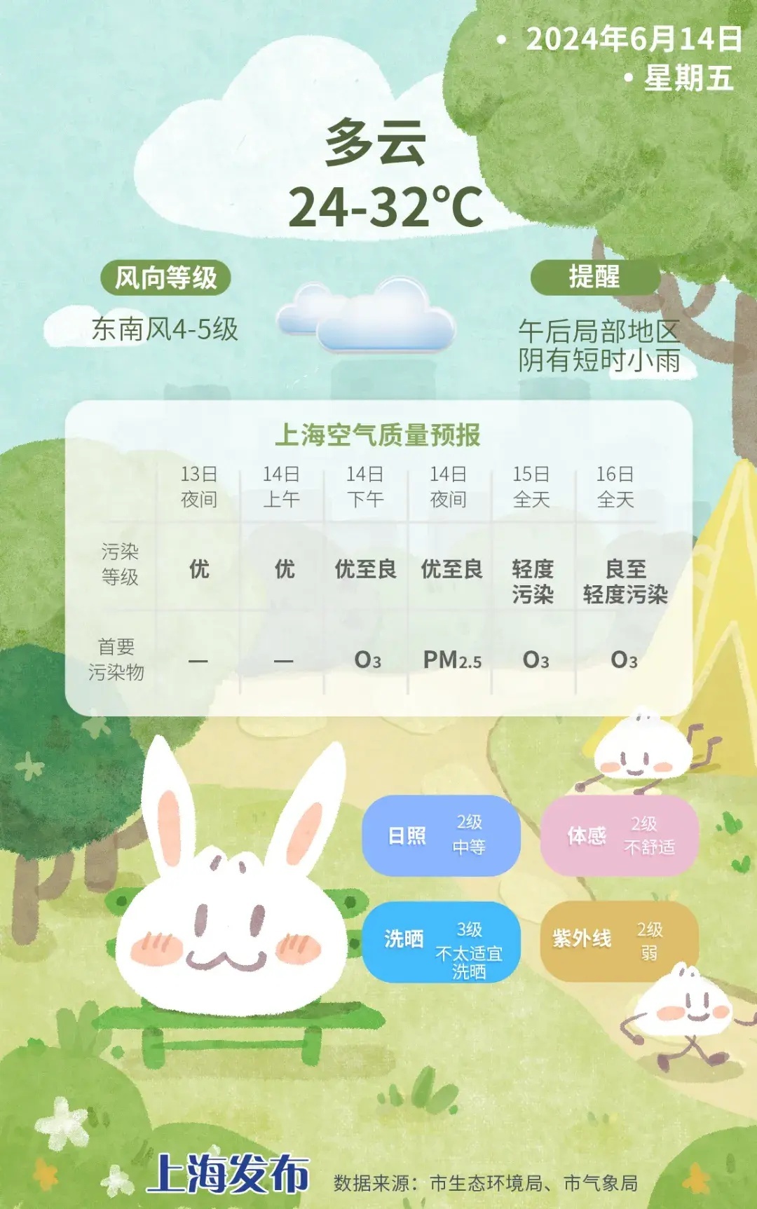 6月15日(周六):多云,午后局部阴有短时阵雨,24~34度