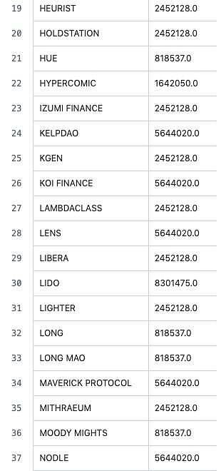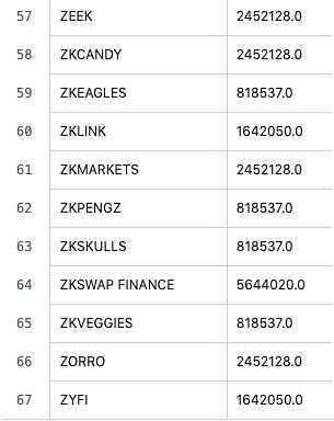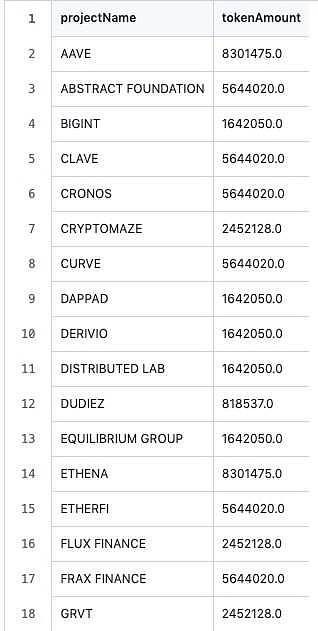 根据 ZKsync公布的结果,总共有67个链上项目获得了空投,数额不等。具体情况如下图: