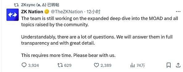 而针对以上这些质疑,zkSync官方回复称,“团队仍在致力于深入研究 MOAD 和社区提出的所有问题。可以理解,大家有很多疑问。我们将以完全透明和详细的方式回答这些问题。这需要更多时间。请耐心等待。”