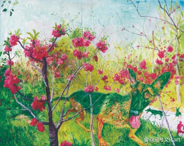“桃花”与“绿狗”几乎诞生于同一时期,花草树木间仿佛隐藏了艺术家心间了不断的心事。早在周春芽初尝《绿狗》系列时,就让狼狗和桃花共处一画,他觉得“桃花的温和艳丽与狼狗的暴力并置在一起,形成一种强烈的视觉和心理反差,让我着迷”。他将东方传统写意与西方强烈色彩融合为一体,桃花的艳丽和狗的亮绿交相辉映,尽显冲突下的和谐与美感。
