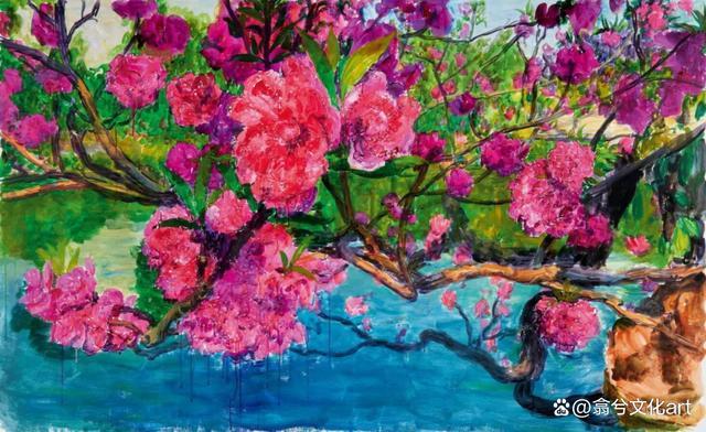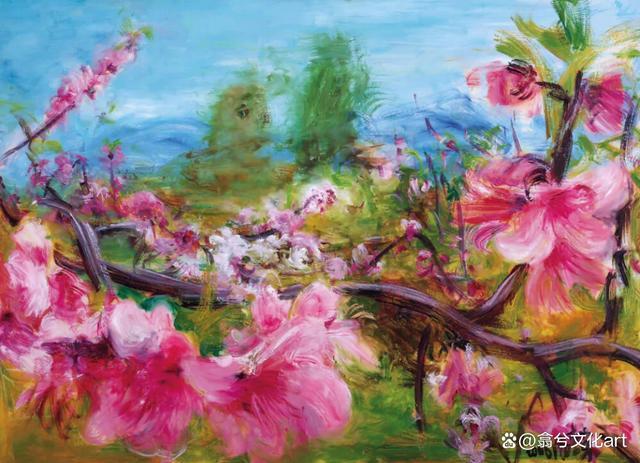 2005年后,周春芽笔下的桃花灵感来源于成都龙泉山看桃花的亲身经历,再观他的《桃花》系列,既有一枝独秀,又有处在一定时空环境中的桃林风光。除了绿野红花,时而还有人影掠过。通过冷与暖的色调,形与色的对比协调,将花与树、人与景集合起来共同追波逐浪,把整个画面卷入激情的海洋。桃之夭夭,灼红了人的灵魂和欲望;绿色,唤醒了人们回归自然的夙愿;蓝色,则把人的心情染上晴空的色彩。艳丽的野性,犹如张扬的生命在画面中绽放开来。