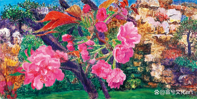 周春芽作为中国当代艺术界的杰出代表之一,其作品融合了传统与当代,以及东西方元素,形成了独特的艺术风格。1989年从德国留学回来的周春芽并没有让自己的艺术风格完全投向于西方体系,而是与自身本土文化相结合,从而探索书写性绘画的风格。周春芽油画色彩中极具个人风格特点,鲜艳明媚,前卫奔放,内在潜藏着对中国传统绘画精神的追求与向往。在四十余年的艺术创作实践中,以油画、素描、雕塑等不同形式不断突破,寻求变化,开创了中国当代艺术文人风格绘画。由伤痕美术时期的“藏族系列”到后来的“山石”“绿狗”“桃花”“园林”经历不同时期的蜕变,最终成就了周春芽风格的文人美感。