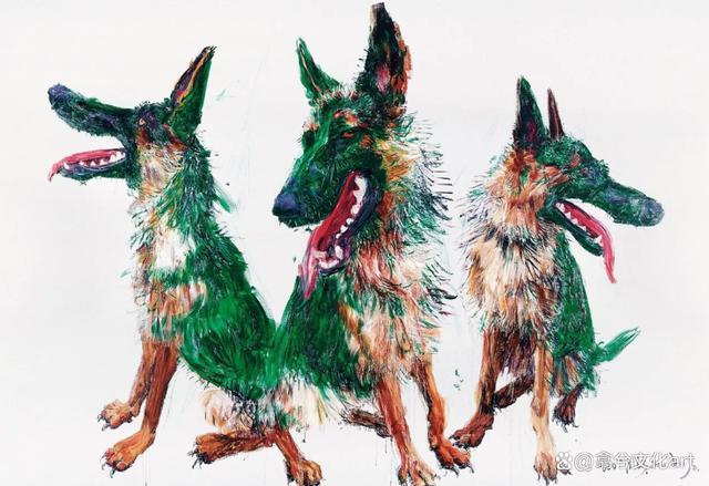 1997年,周春芽开始尝试用绿色来画狗,这也是他对于色彩的一种实验,此后“绿狗”的形象成为延续不变的主题。绿色给人一种宁静,舒缓的感觉,而艺术家笔下的绿狗总是龇牙咧嘴,在一身绿的衬托下吐着鲜红的舌头,给人一种内在的强烈冲突。《黑根》系列是起源于艺术家与狗的纯粹情感表达,《绿狗》则更像一部复杂的交响曲,超越了个人情感,是对人类命运的思悟。