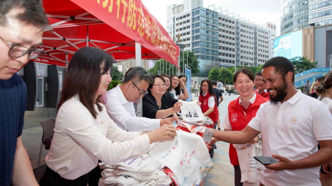 活动现场毗邻中国规模最大、产品种类最齐全的综合电子专业交易市场“华强电子世界”,人流量密集。数十名宣传志愿者向过往群众分发“防诈反诈”“金融消费者八项权益”“反洗钱”“征信知识”“资管新规”“人民币真伪识别”等宣传材料,一对一耐心解答群众对信用贷款、规范用卡等业务咨询,并通过讲解最新诈骗案例剖析生活中常见金融风险,帮助群众提升风险识别能力,守好百姓“钱袋子”。在防范非法集资趣味问答环节,群众通过扫码进行场景模拟对话,以寓教于乐的方式提升对“非法集资”的认知。