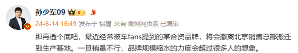 近日,CNMO注意到,汽车行业分析师孙少军发文透露称,最近经常被车fans提到的某合资品牌,将会撤离北京销售总部搬迁到生产基地。一旦销量不行,品牌规模缩水的力度会超过很多人的想象。孙少军并未透露具体的品牌名称,但“北京现代”“北京奔驰”“一汽大众”等品牌存在一定可能。