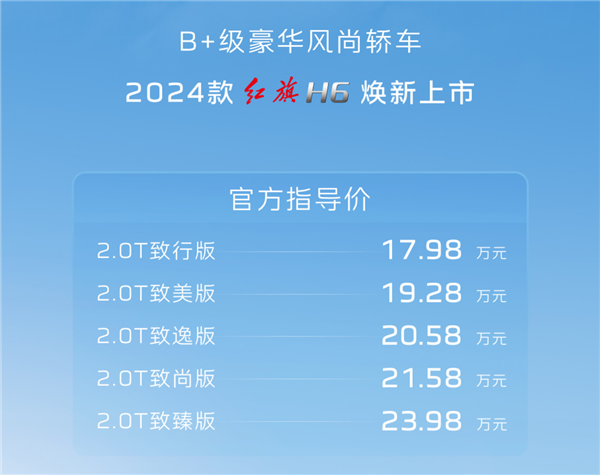 快科技6月14日消息,今日晚间,2024款红旗H6上市,共推出5款车型,售价为17.98-23.98万元。