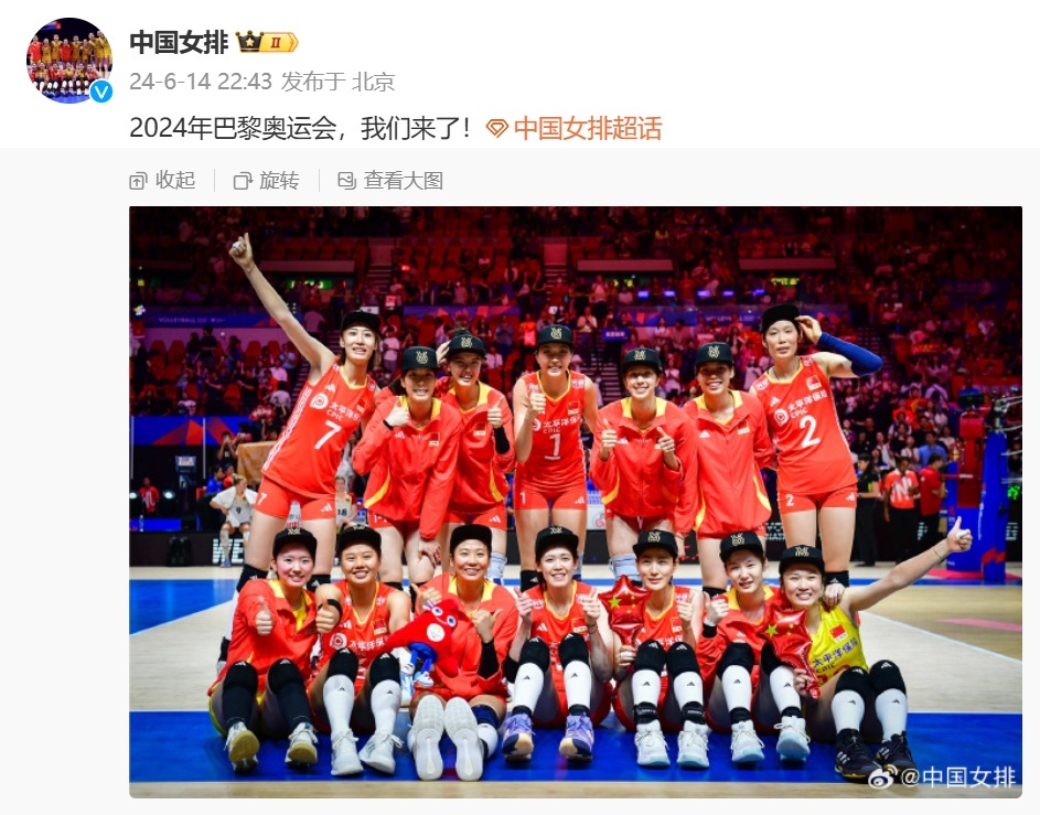 赛后,中国女排官方账号发文:“2024年巴黎奥运会,我们来了!”