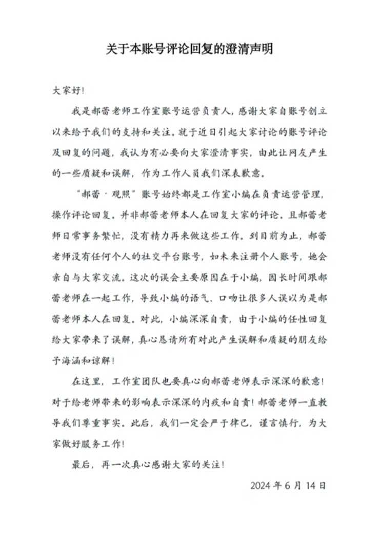 6月14日,该工作室发声明称:“郝蕾·观照”账号始终都是工作室小编在负责运营管理,并非郝蕾老师本人在回复大家的评论。到目前为止,郝蕾老师没有任何个人的社交平台账号。因长时间跟郝蕾老师在一起工作,导致小编的语气、口吻让很多人误以为是郝蕾老师本人在回复。