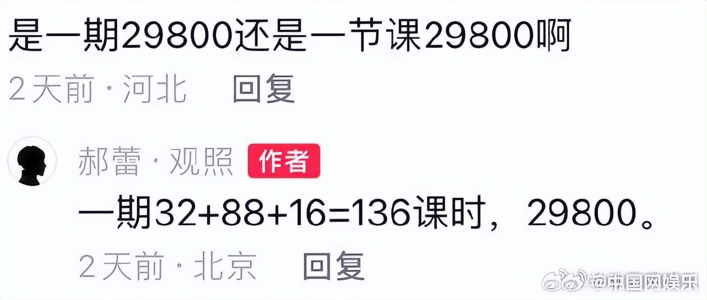 据中新文娱报道,郝蕾表演课程是29800元一期,32(通识课)+88(专业课)+16(创作指导)=136课时,一个课时的均价约为219元,授课由郝蕾及其表演团队进行,表演方向目前只能录取20人。