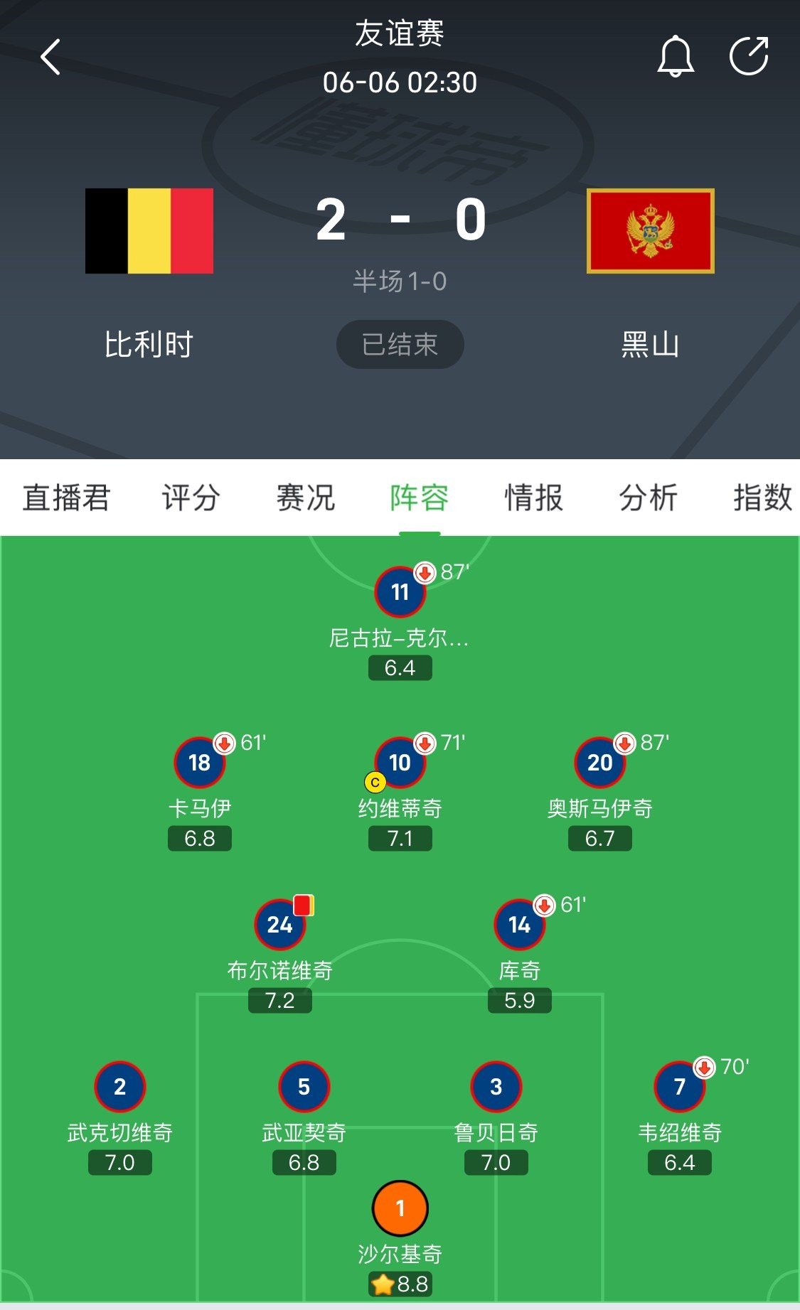 北京时间6月6日凌晨进行的一场友谊赛中,黑山0-2不敌比利时,沙尔基奇首发出战,奉献8次扑救,获评全场最高分。