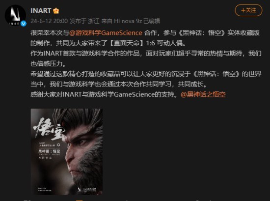 最近,知名手办制造商INART发文庆祝称,有幸与游戏科学公司携手,共同打造《黑神话:悟空》实体珍藏版的“直面天命”1:6比例可动人偶。
