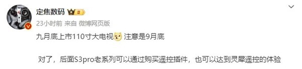 该博主发文称:9月底上市110英寸大电视,注意是9月底。另外,后续S3 Pro系列智慧屏可以通过购买遥控插件,达到灵犀遥控的体验。虽然博主没有明说是哪个品牌,但从“S3 Pro”和“灵犀”这两个关键词不难猜出是华为。