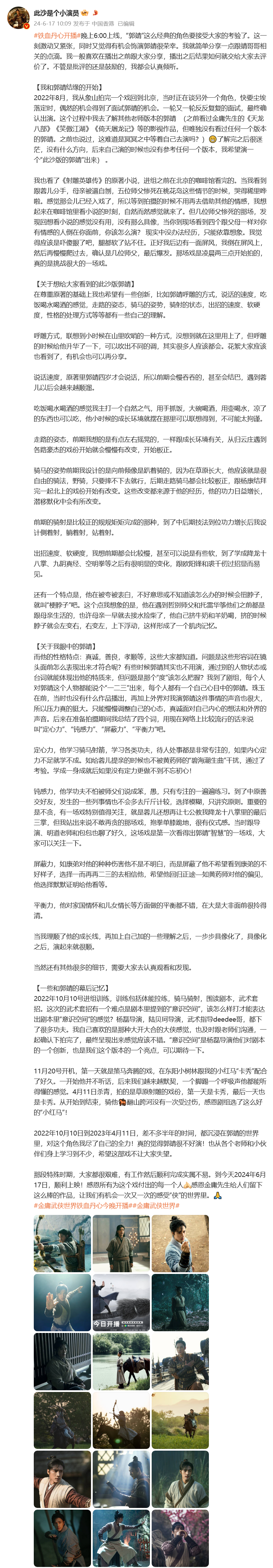 晚上6:00上线,“郭靖”这么经典的角色要接受大家的考验了。这一刻激动又紧张,同时又觉得有机会饰演郭靖很荣幸。我就简单分享一点跟靖哥哥相关的点滴。我一般喜欢在播出之前跟大家分享,播出之后结果如何就交给大家去评价了。不管是批评的还是鼓励的,我都会认真倾听。