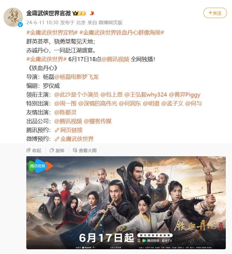 据悉,6月11日,古装武侠剧《金庸武侠世界》官宣定档6月17日18点腾讯视频全网独播。