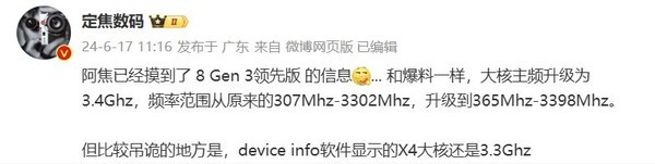 但奇怪的是,某些用户在使用device info这类硬件信息检测软件时发现,尽管官方资料标明大核主频已达到3.4GHz,软件显示的X4大核频率却依然标注为3.3GHz。这一差异可能源于软件尚未更新支持最新硬件规格,或是存在特定条件下的动态调整机制,具体情况有待进一步确认。