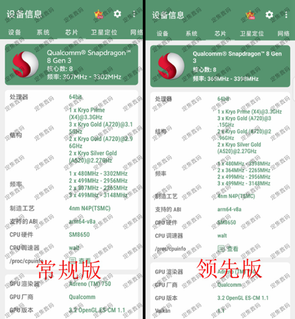 对比之下,骁龙8 Gen 3的CPU最高频率维持在3.3GHz,而GPU核心频率则从903MHz适度提升至1.0GHz。这样的参数布局表明,高通在设计这两款处理器时采取了差异化策略,旨在满足不同市场细分领域的需求。