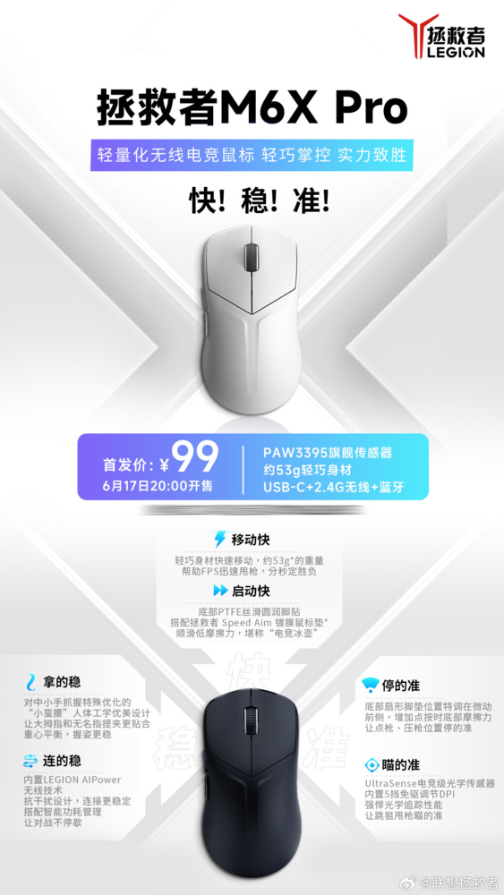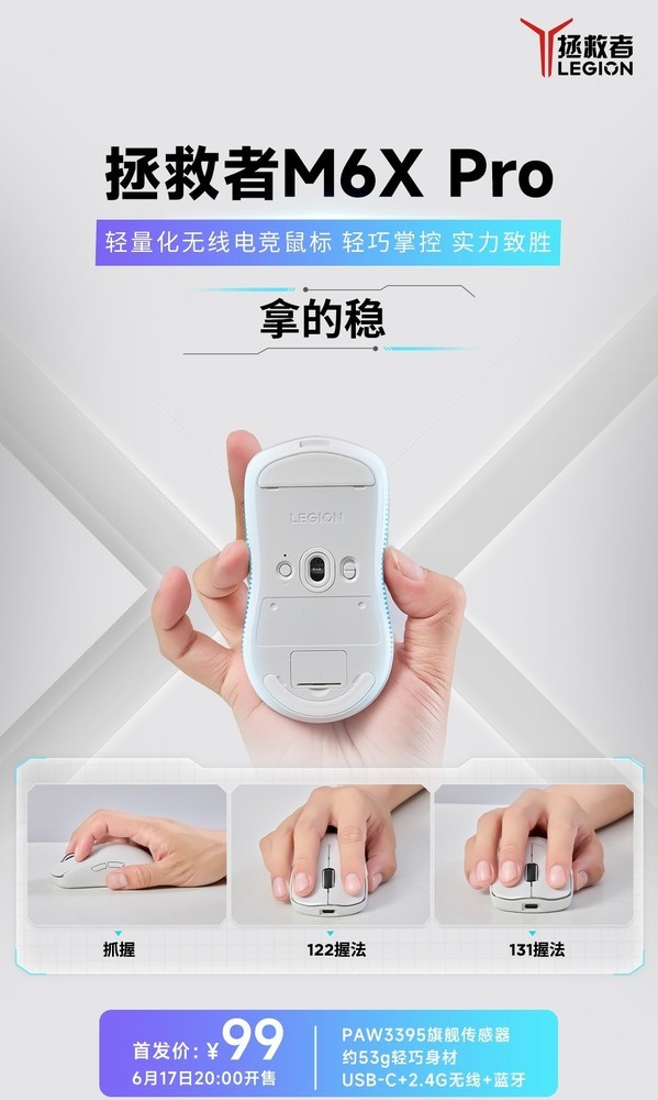 【CNMO科技消息】6月17日,联想拯救者官微宣布,拯救者M6X Pro鼠标已开启预售,将于20:00正式开售,首发价为99元。该搭载PAW3395旗舰传感器,拥有约53g轻巧身材,支持USB-C+2.4G无线+蓝牙三模切换。