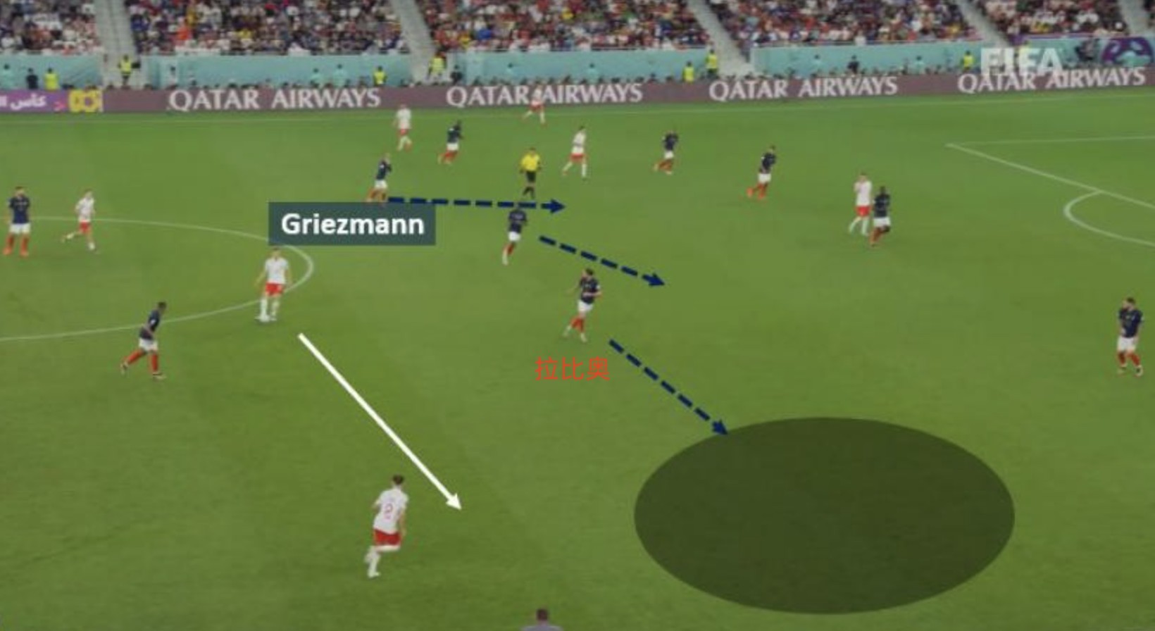 最近法国队在防守时会把阵型转变为平行442。法国在对阵奥地利时,很可能会让一名前锋在姆巴佩左侧活动(上图蓝色圆圈中的图拉姆),并在防守时回撤保护左翼,这样可以避免一名中场球员过度左移去覆盖左侧区域,就像上一届世界杯时拉比奥所做的那样。
