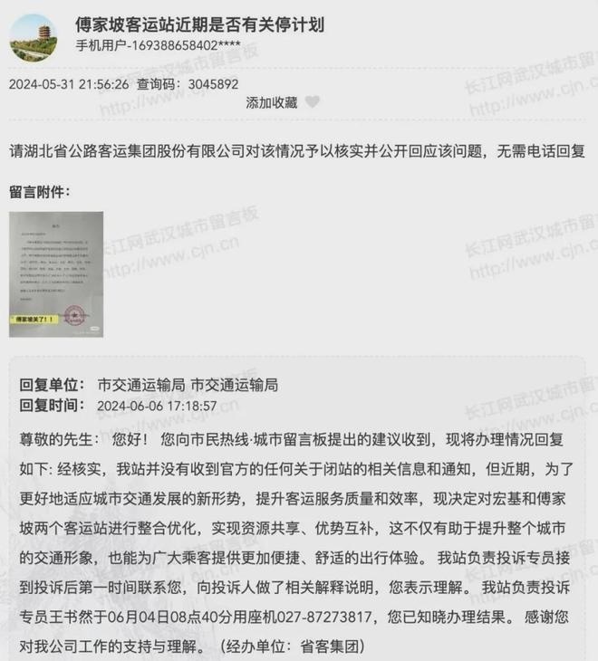 6月6日,武汉市交通运输局在武汉城市留言板就“傅家坡客运站近期是否有关停计划”给出回复:并没有收到官方的任何关于闭站的相关信息和通知,但近期,为了更好地适应城市交通发展的新形势,提升客运服务质量和效率,现决定对宏基和傅家坡两个客运站进行整合优化。