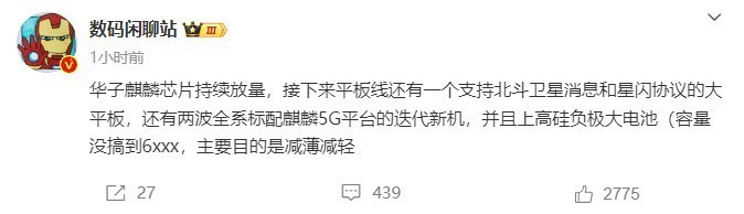 中关村在线消息: 近日,爆料博主@数码闲聊站曝光称华为公司正持续放量麒麟芯片,据称接下来将推出一款支持北斗卫星消息和星闪协议的“大平板”,同时还将推出“两波配备高硅负极大电池、全系标配麒麟 5G 平台的迭代新机”。