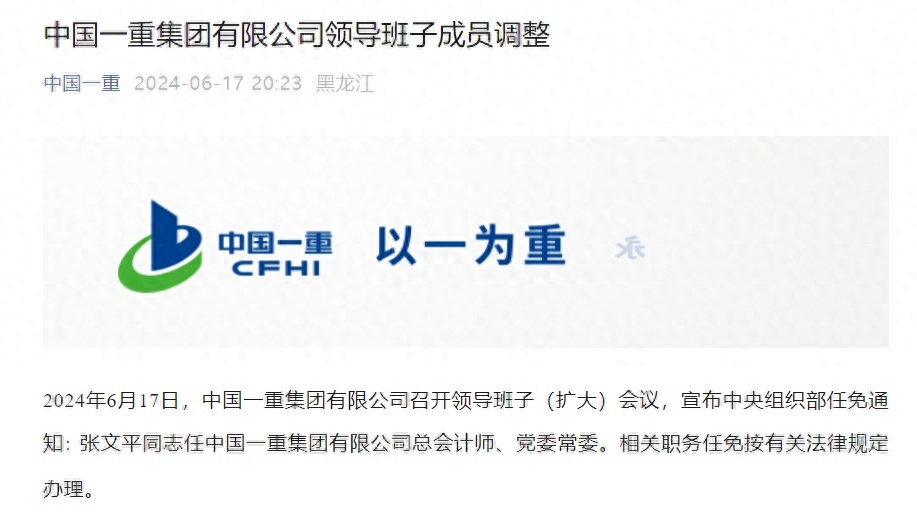 据“中国一重”公众号消息,6月17日,中国一重集团有限公司召开领导班子(扩大)会议,宣布中央组织部任免通知:张文平同志任中国一重集团有限公司总会计师、党委常委。相关职务任免按有关法律规定办理。