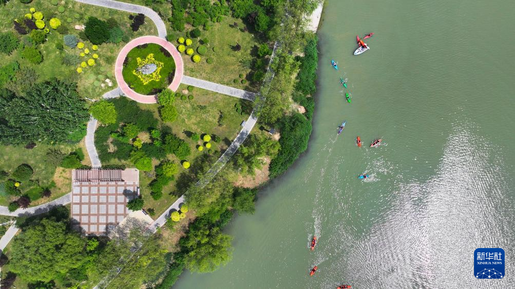市民在宁夏银川市典农河上休闲运动(6月5日摄,无人机照片)。